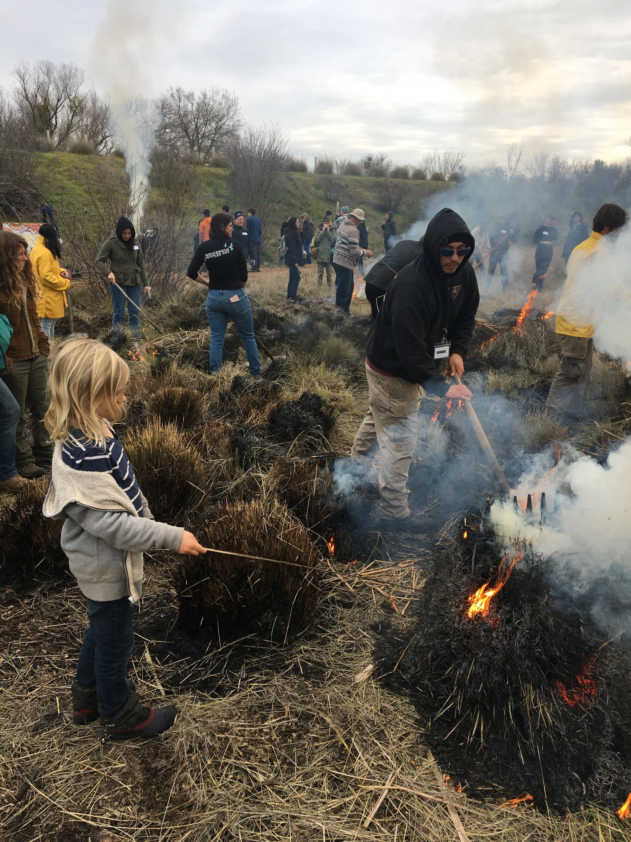 Community burning of deer grass garden as part of a cultural burn, for future basketry materials at the Cache Creek Preserve.